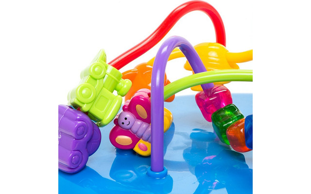 - зверху розташований лабіринт із яскравими намистинами для розвитку дрібної моторики;