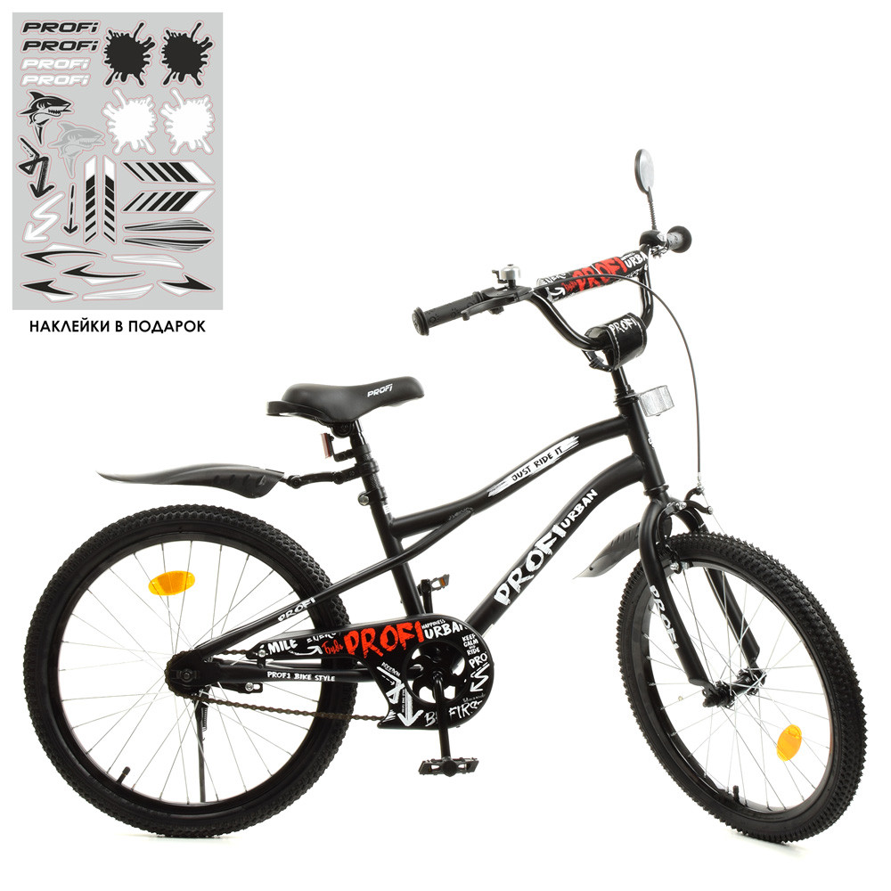 Велосипед дитячий PROF1 20д. Y20252, чорний матовий — обладнаний складаною підніжкою для зручнішого паркування, він базується на надувних гумових колесах, що робить їзду комфортнішою, велосипед має міцну сталеву раму, що гарантує виробу високу надійність і довговічність.